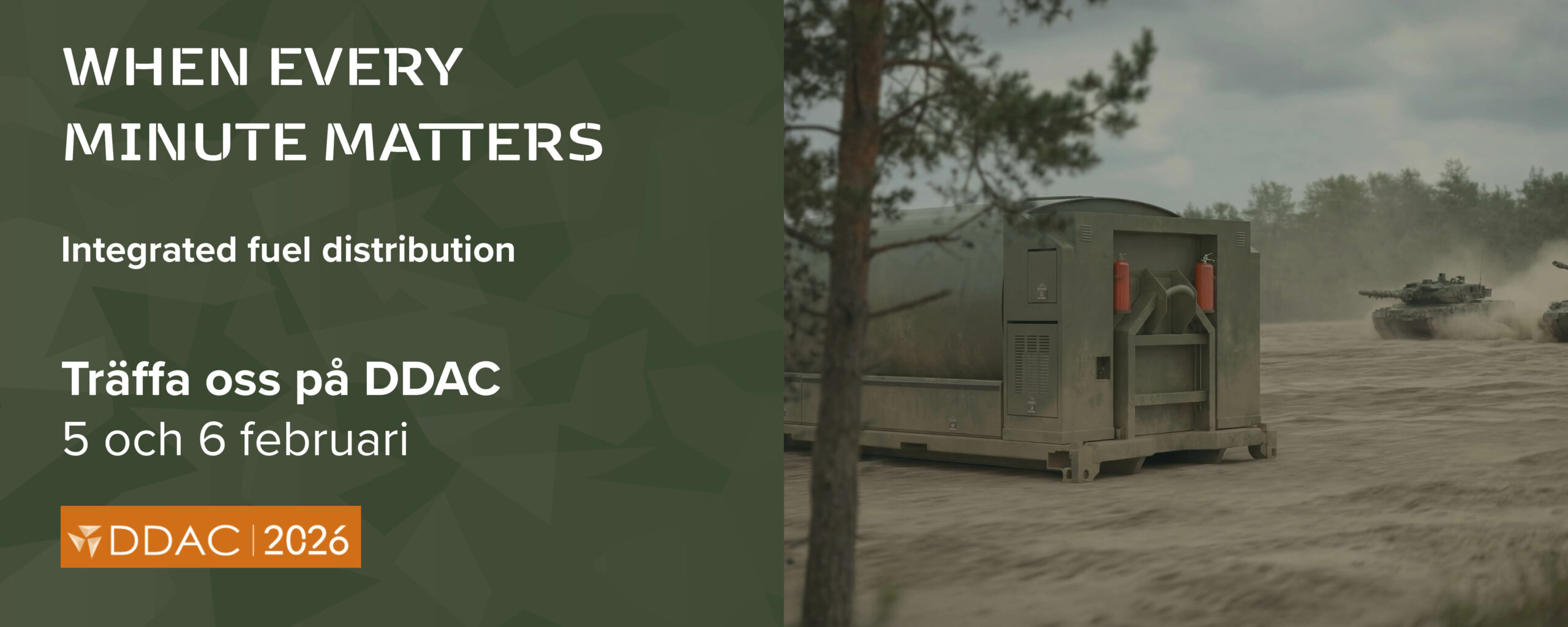 Kom och träffa oss på DDAC-monter 36, balkong 2, där vi berättar om hur man kan minska uppehållstid och fotavtryck på slagfältet i omstridda miljöer med vårt marknadsledande sortiment av bränsletankbilar och containrar.